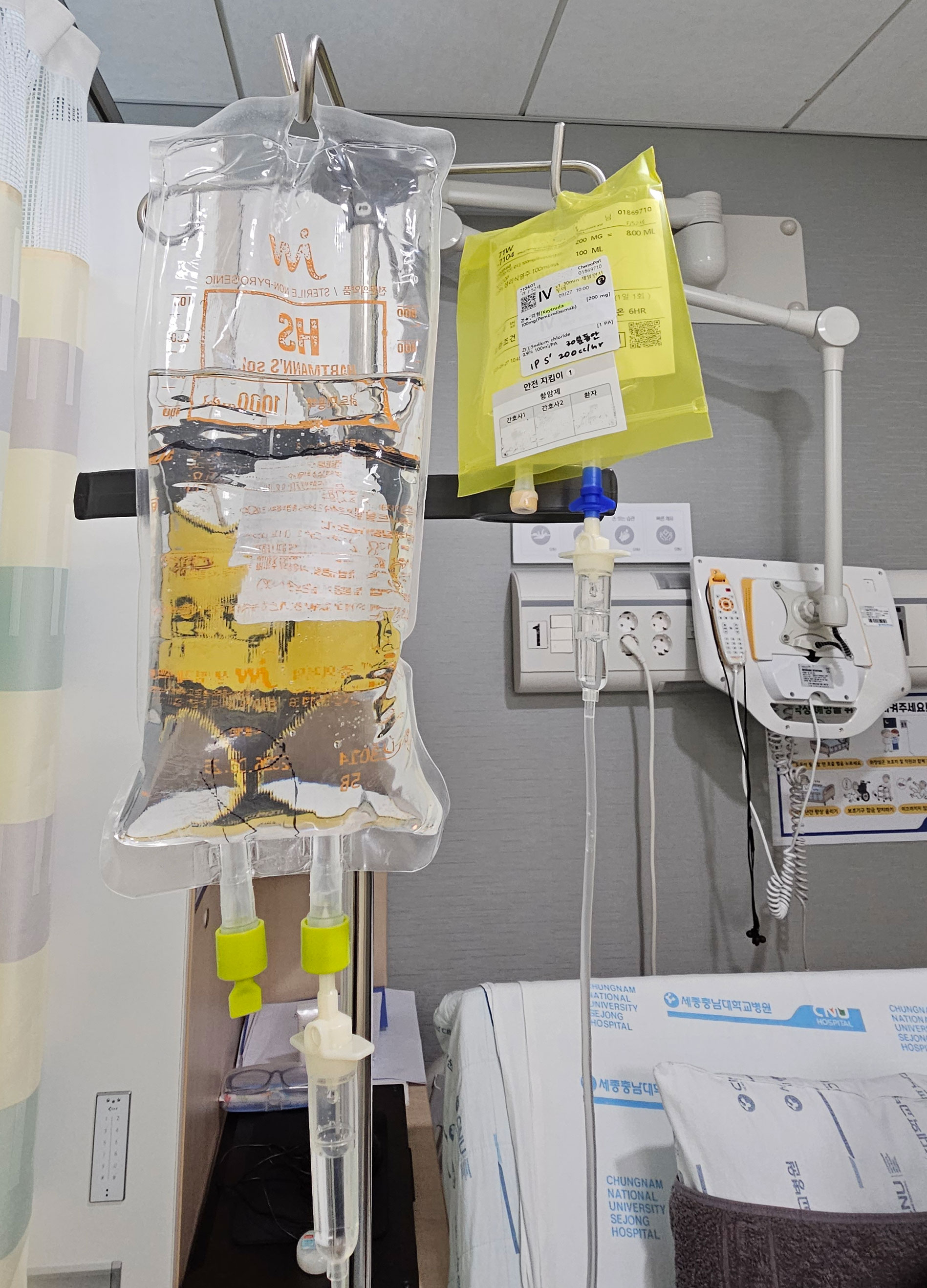 오후 1시 키트루다로부터 시작해 탁솔(파클리탁셀), 카보플라틴으로 이어진 투약시간이 밤 10시 30분이 되어야 끝이 났다. 처음이라 그런지 다소 천천히 투약해주시는 것 같았다. 어제 밤에 잠을 잘 못자서인지, 약 기운인지는 확실치는 않으나 투약 내내 꿀잠을 잤다.