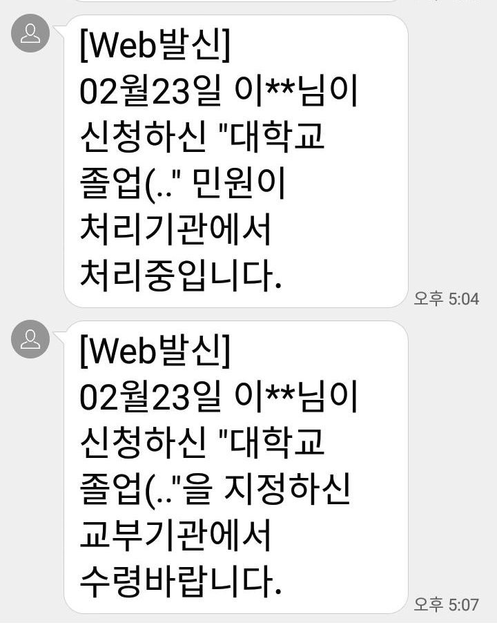 에라. 복잡하니 그냥 대학교 졸업자로 가자 하고 대학교 졸업증명서를 우선 신청했는데, 인터넷 검색을 통해 좀 헤매다보니 대학원 졸업증명서를 신청하면 결국 해당 대학원으로부터 석사학위수여증명서를 발급받는다는 사실을 알게됐다. 헐. 그렇군. 그럼 한번 신청해봐야겠다 하고 문자 그대로 대학원 졸업증명서 발급 신청을 해놓았더니 30분도 채 되지 않아 우리 동네 주민센터에 서류가 도착했다는 메시지를 받았다. 참 좋은 세상에 살고 있구나 새삼 실감했다.